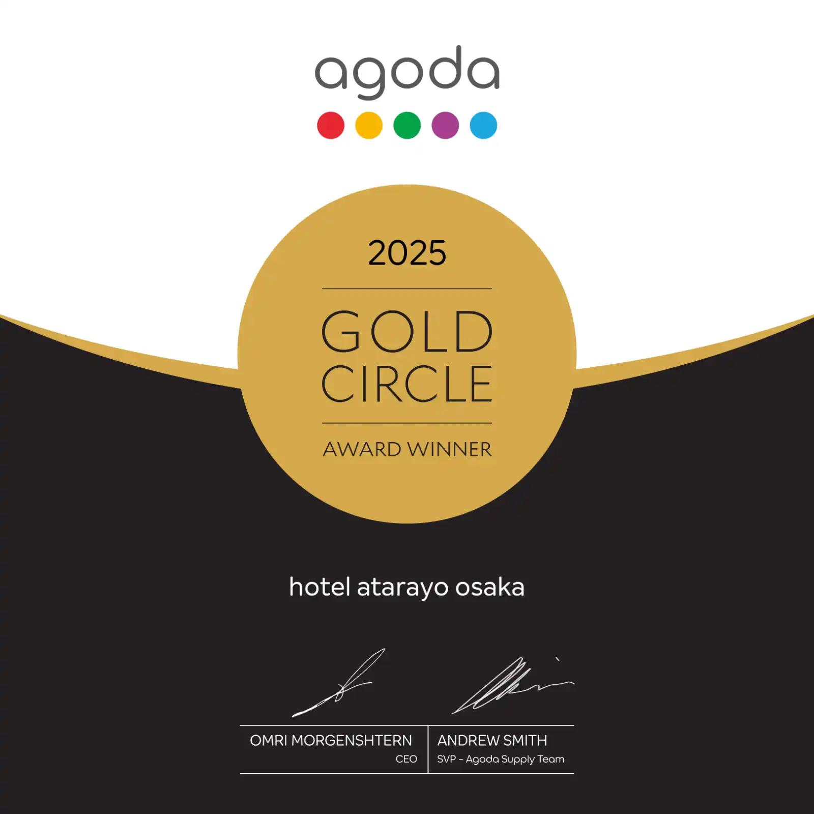 この度、Hotel atarayo Osakaは 世界的な旅行予約サイトagoda(アゴダ)において 「アゴダゴールドサークルアワード2025」を受賞いたしました。